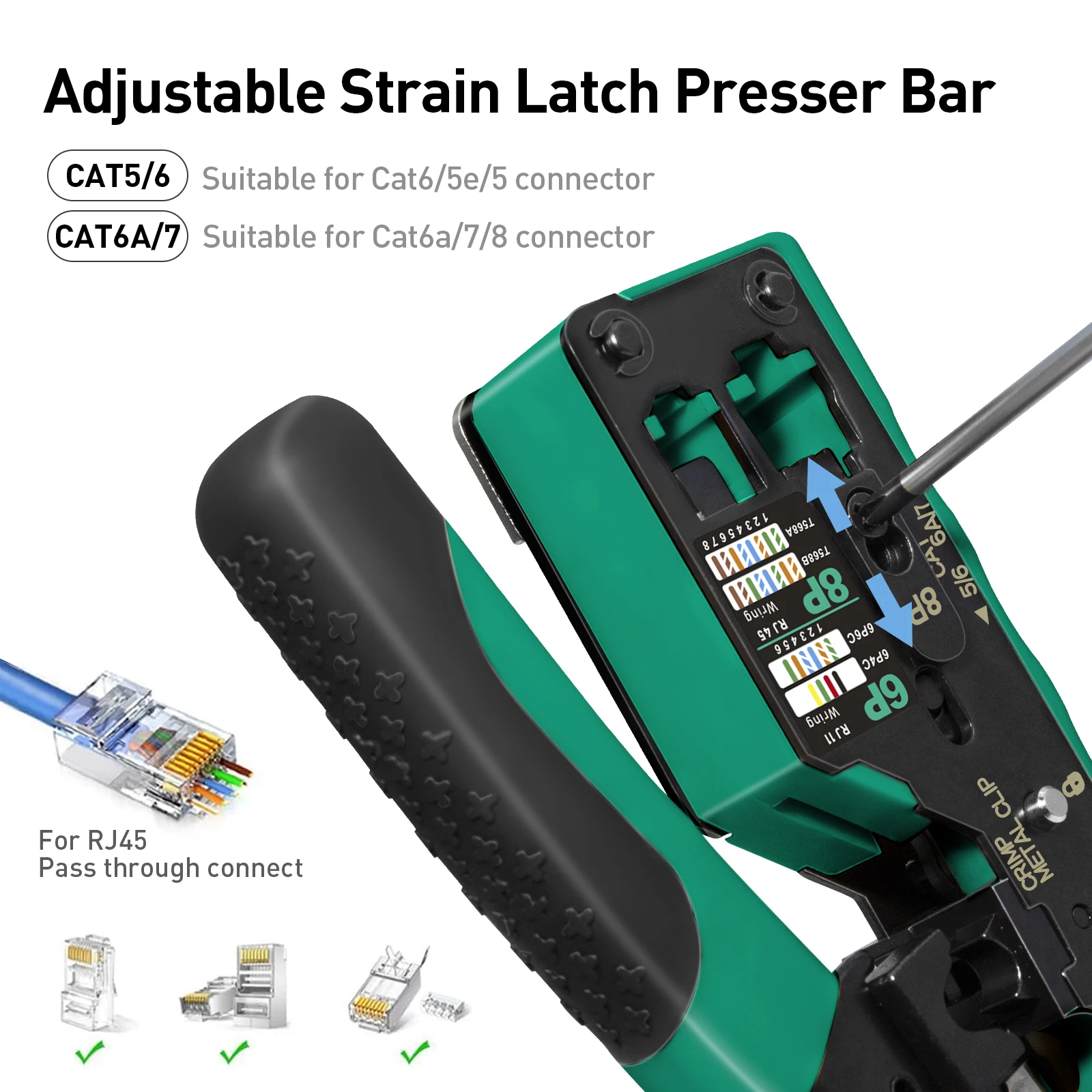 Equipada con una barra prensadora de pestillo de tensión ajustable, esta herramienta es compatible con los conectores Cat5e, Cat6, Cat6a y Cat7.Garantiza una conexión segura para aplicaciones de paso RJ45, brindando flexibilidad para diferentes necesidades de redes.