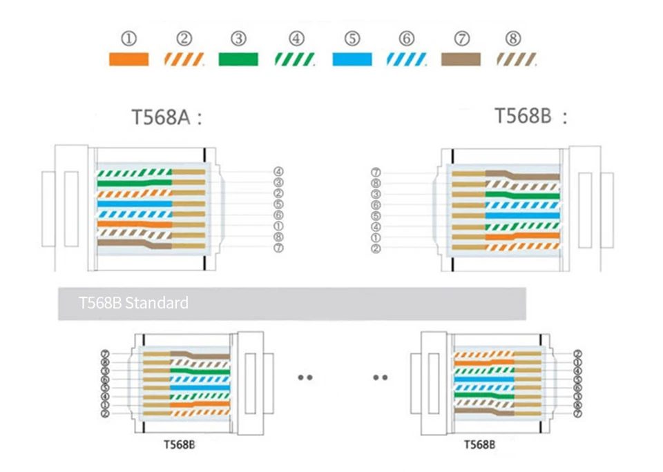 El cable Ethernet estándar tiene un cable de 8 colores en el interior, el cable debe organizarse como se muestra a continuación, principalmente como el método T568B