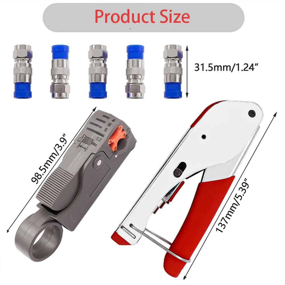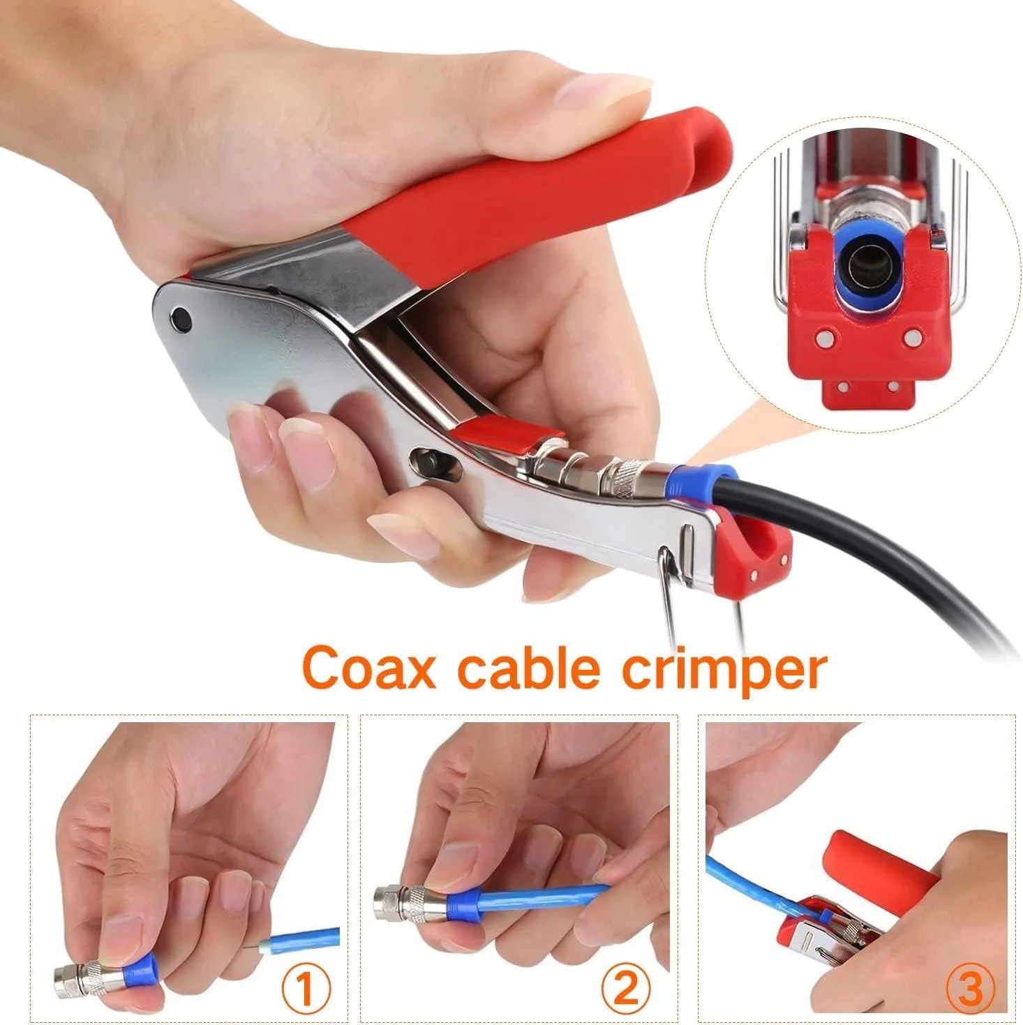 El kit 3 en 1 incluye un engarzador, un pelador ajustable y 20 conectores RG6 tipo F para todas sus necesidades de reparación e instalación de cables.