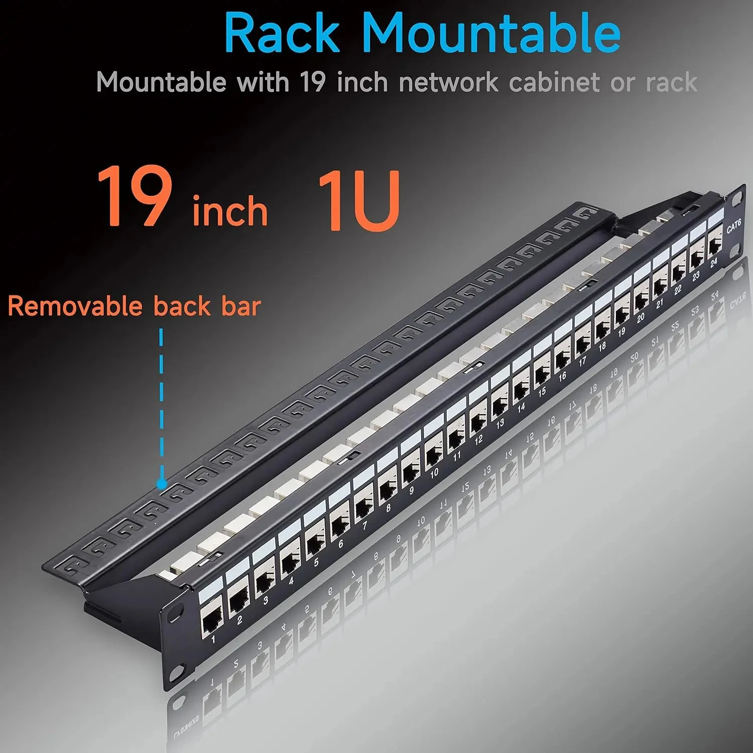 Montable en bastidor: el panel de conexión de montaje en bastidor 1U se puede montar en un gabinete de red o bastidor estándar de 19 pulgadas.Asegure los cables que se conectan en la parte posterior del panel jack rj45 usando bridas.