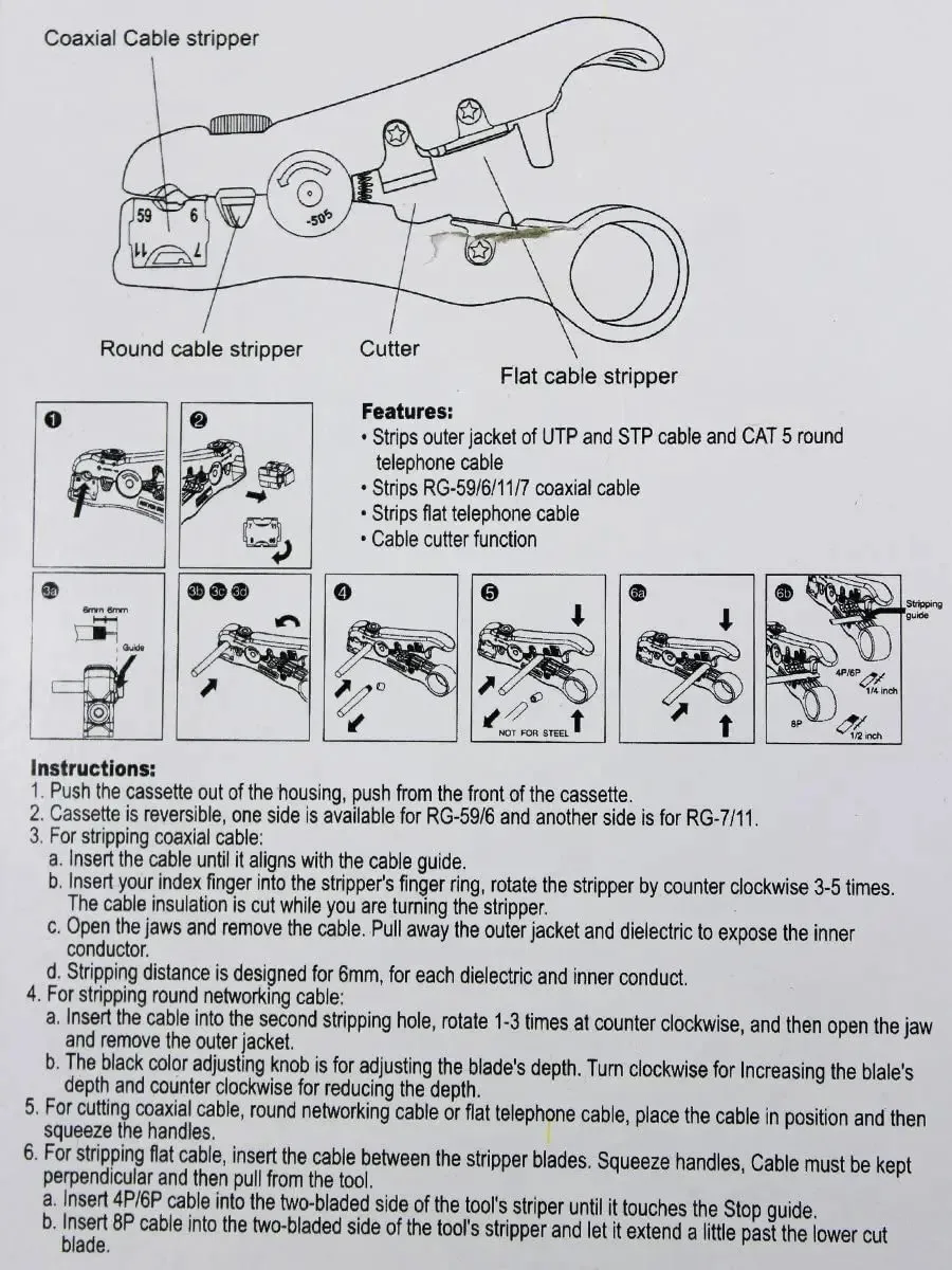 Diseñado para una variedad de cables, incluidos cables coaxiales (RG59, RG6, RG7, RG11) y cables de red (Cat5e, Cat6, UTP, STP), adecuados para cables redondos y planos.