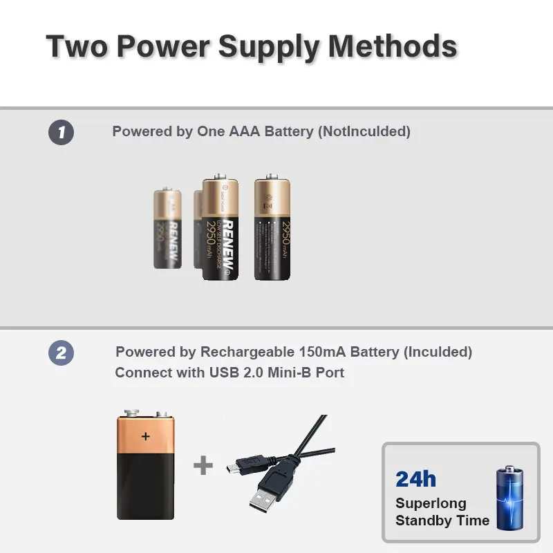 4. Dos métodos de alimentación: con una batería recargable de 9 voltios o a través del puerto de alimentación tipo c. 24h de tiempo de espera superlargo. Interruptor de alimentación protector para bajo consumo de energía.