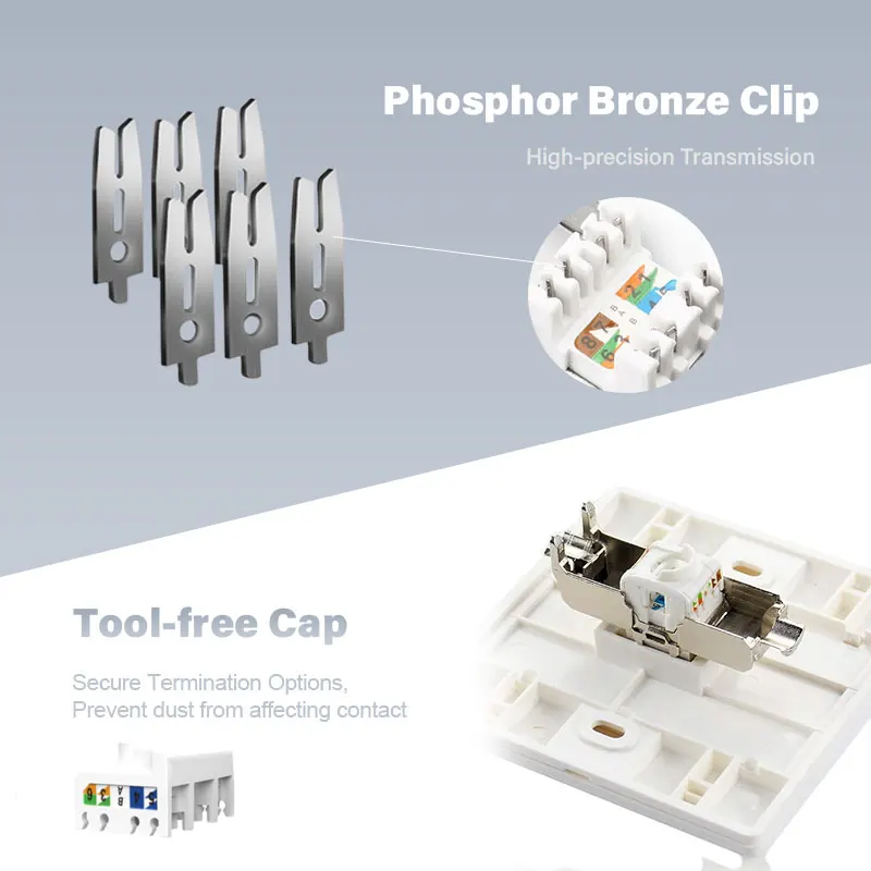 •Columna de cables de bronce fosforado: el rendimiento de transmisión y contacto alcanza el estándar de red de hasta 10 Gbps.Diseño biselado estándar de 45 grados para garantizar una fácil instalación del cable.