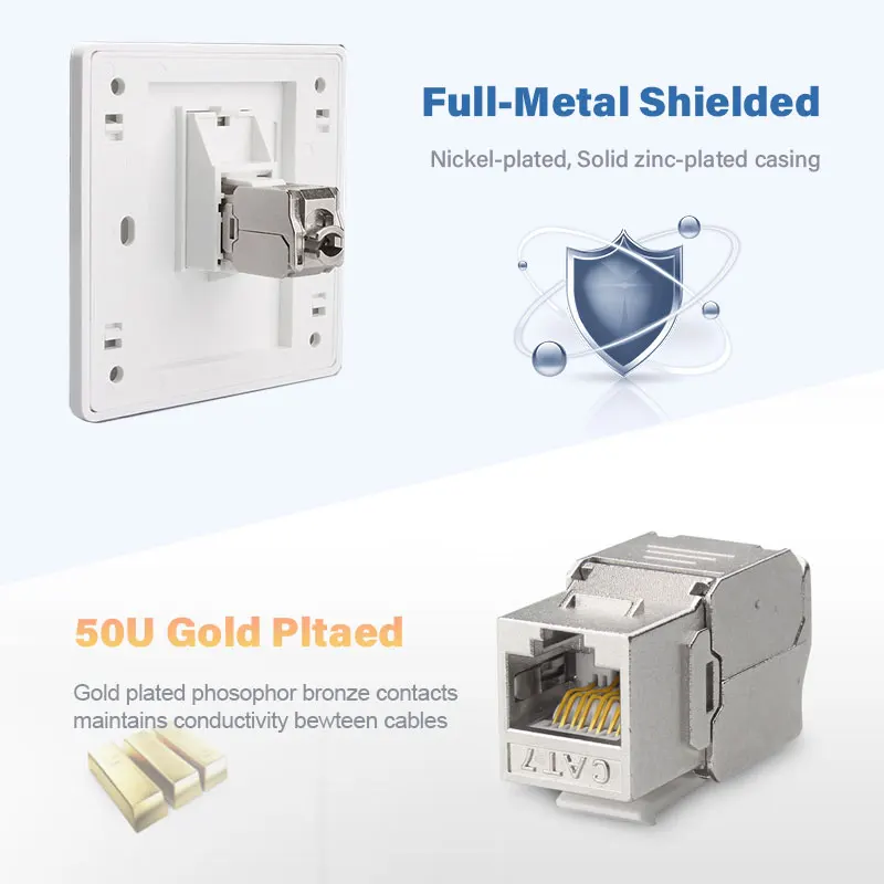 •El módulo jack keystone de metal Cat7 se caracteriza por su carcasa protectora de aleación de zinc antioxidante y su estructura de protección blindada de cobre puro con características estables y antiinterferencias.