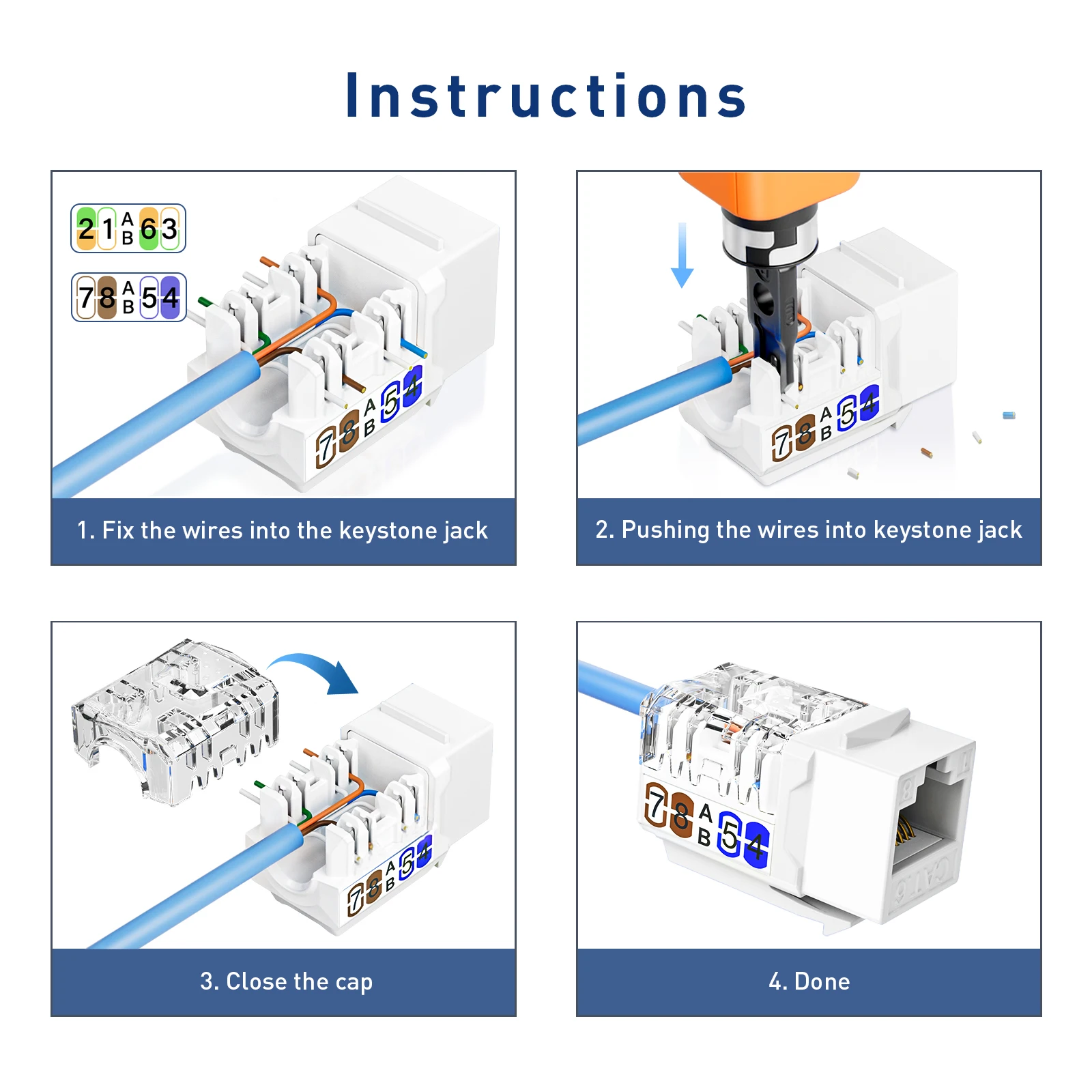Los conectores Ethernet Keystone admiten los estándares de cableado T568B. Los terminales IDC aceptan Herramientas de impacto 110 y proporcionan alivio de tensión del cable. Adecuado para cables Ethernet de 23 y 24 AWG.