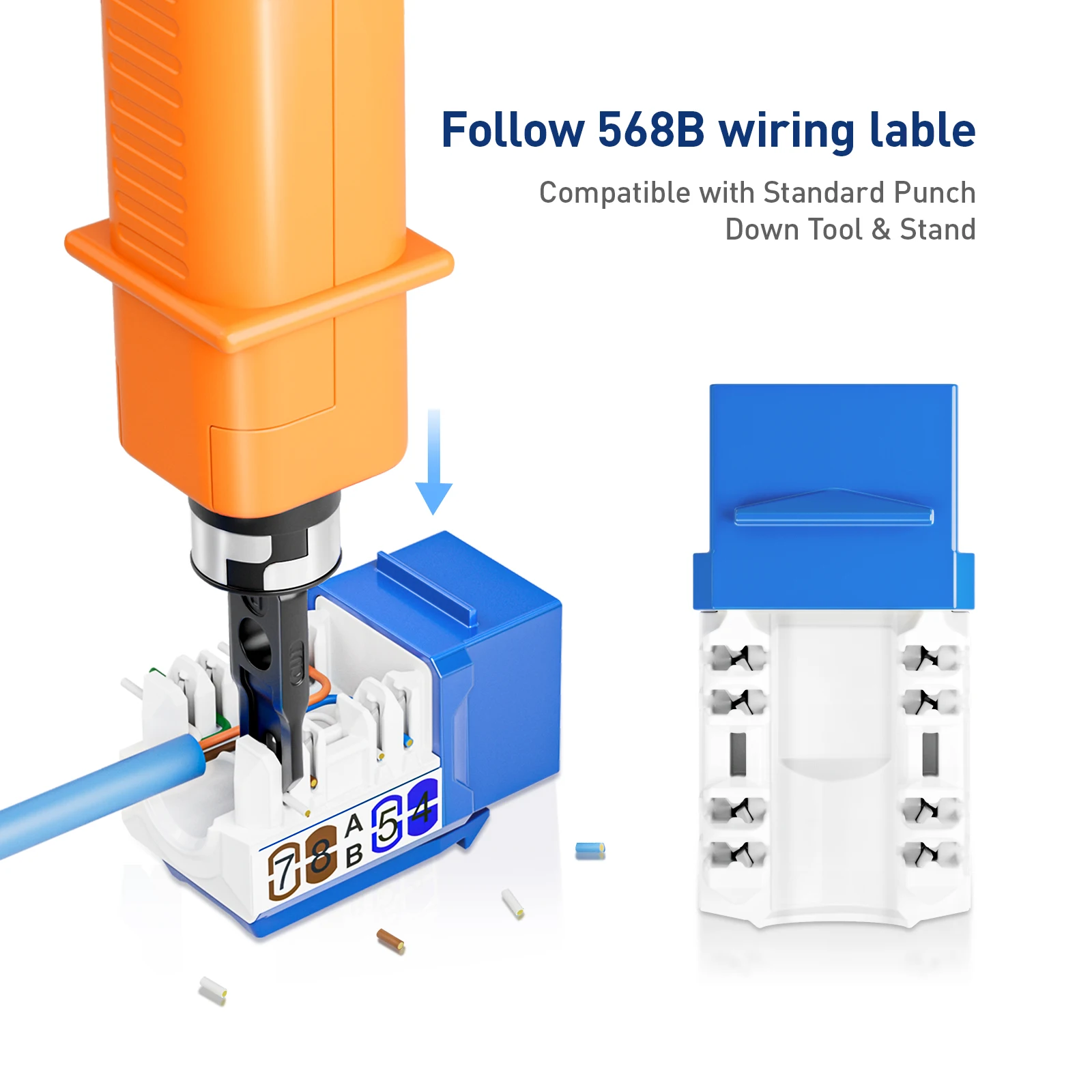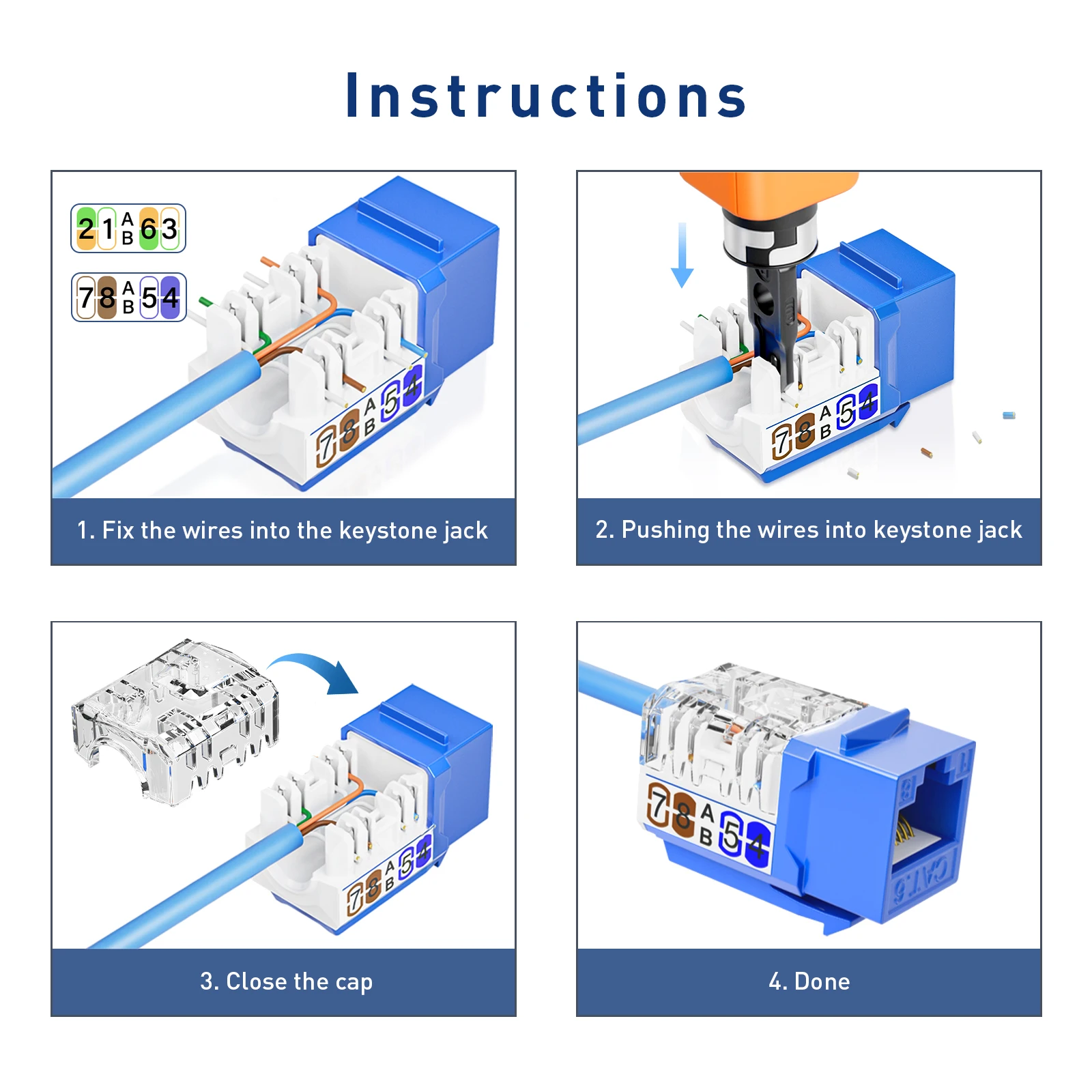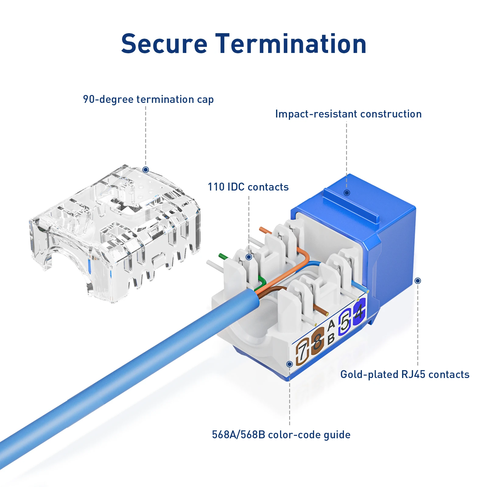 Capables de rendimiento de categoría 6 que admiten velocidades Gigabit Ethernet, estos conectores son compatibles con cables Cat6 y retrocompatibles con Cat5 y Cat5e, brindando una red rápida y confiable.