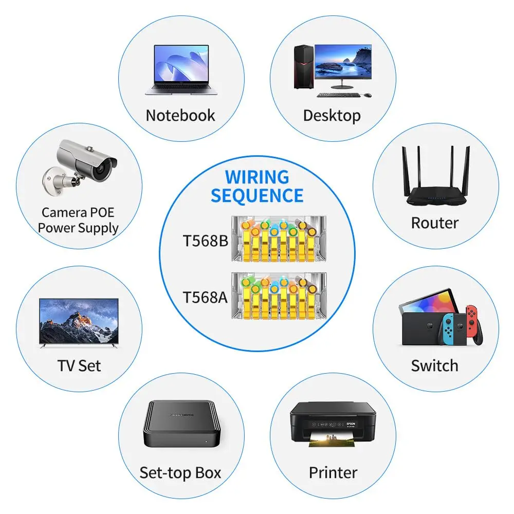 Los contactos de alta calidad pueden aumentar el área de contacto y mejorar la conductividad.Admite canal Ethernet Cat8 de 40 Gigabit para aplicaciones PoE o Ethernet con cable, compatible con versiones anteriores de cables Cat7, Cat6A y Cat6.