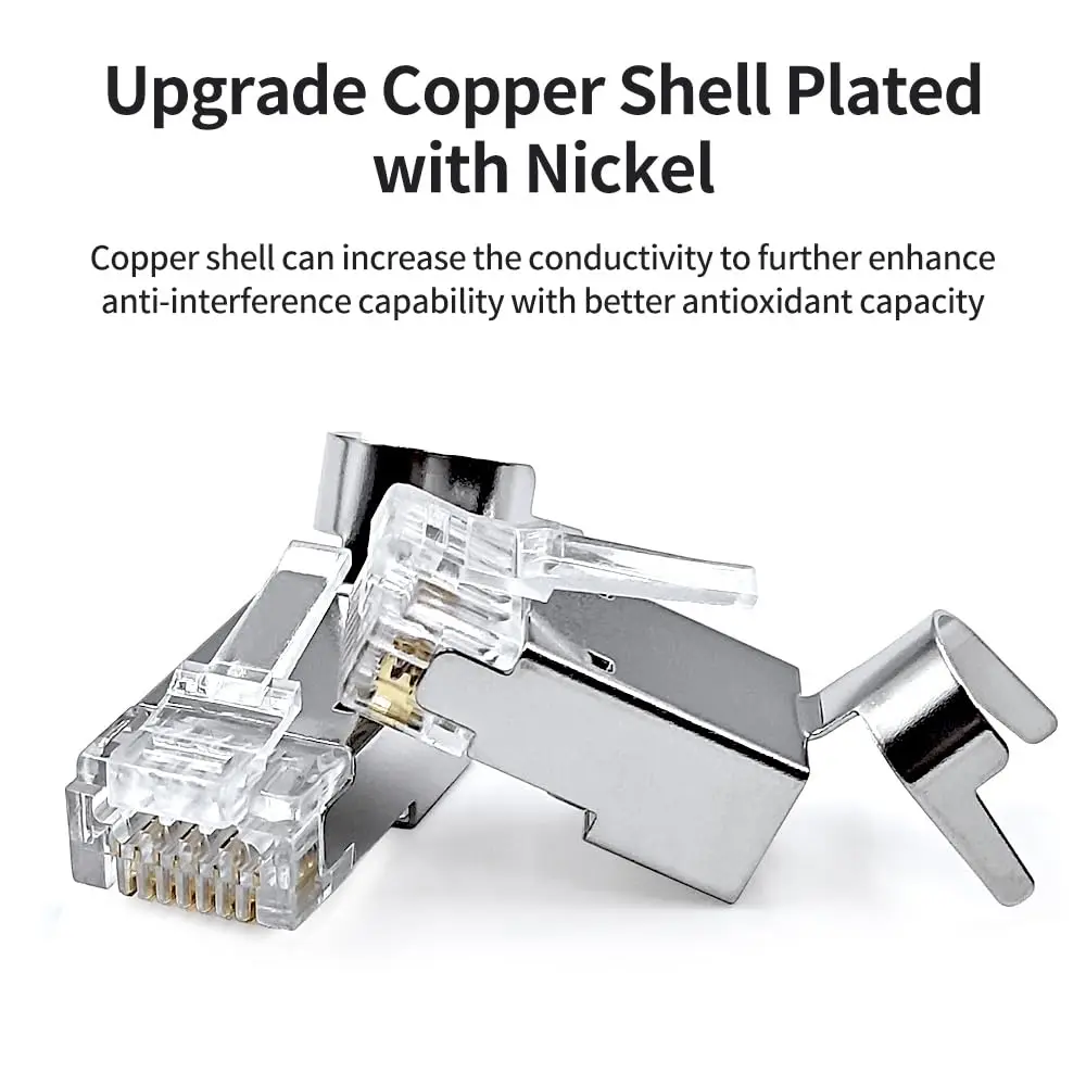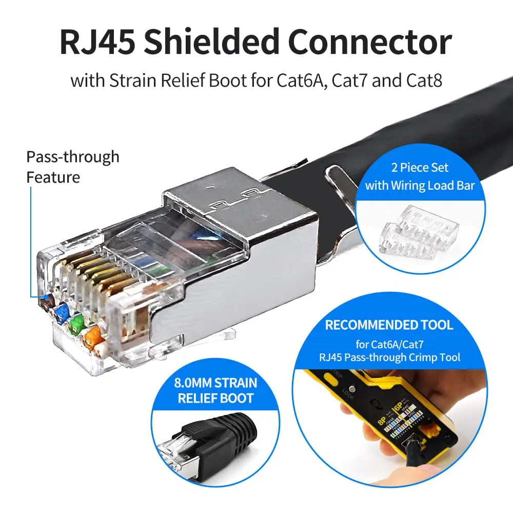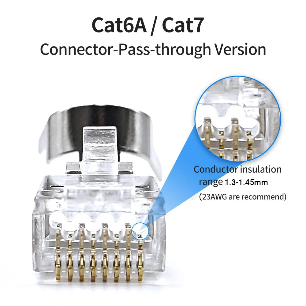El conector termina el cable de par trenzado blindado para hacer un cable Ethernet Cat 6A, Cat7 y Cat8 de longitud personalizada con cable sólido y trenzado redondo de 23 AWG, compatible con versiones anteriores Cable Ethernet Cat6 para conductores aislados con un diámetro de 1,3 a 1,45 mm.