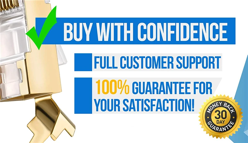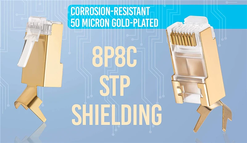 CONSTRUIDOS PARA DURAR: a diferencia de otros conectores Cat7 que son de cobre o niquelados, nuestros enchufes Ethernet RJ45 chapados en oro tienen una mayor durabilidad contra el óxido, la corrosión, la humedad y la humedad.
