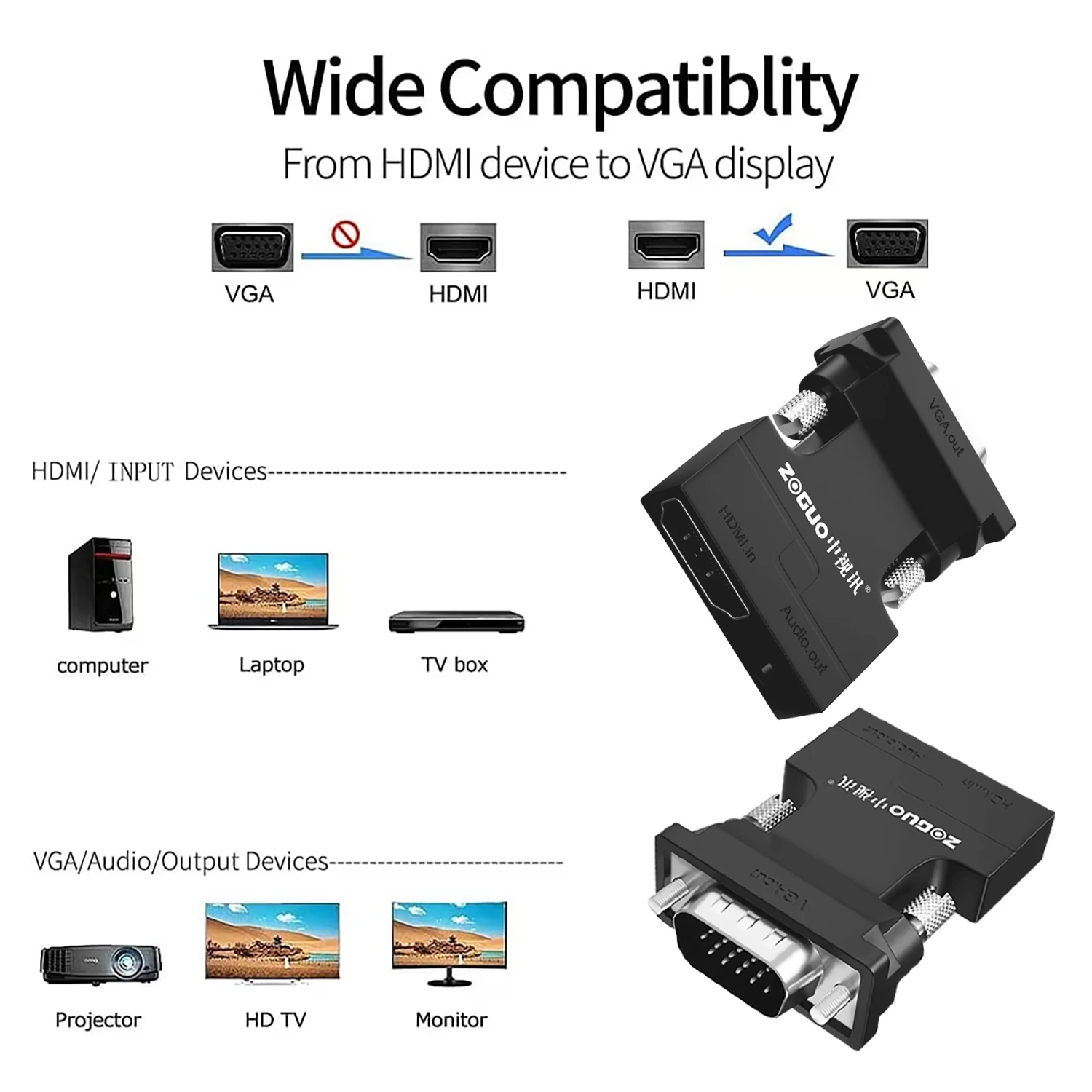 【Ampliamente compatible】Convertidor ZOGUO HDMI hembra a VGA macho adecuado para escritorio, Notebook, ultrabook, Notebook, proyector, DVD, HDTV, reproductor multimedia, caja de cable u otros dispositivos con conexión HDMI. Plug and play, no se requieren controladores, no se requiere fuente de alimentación externa.