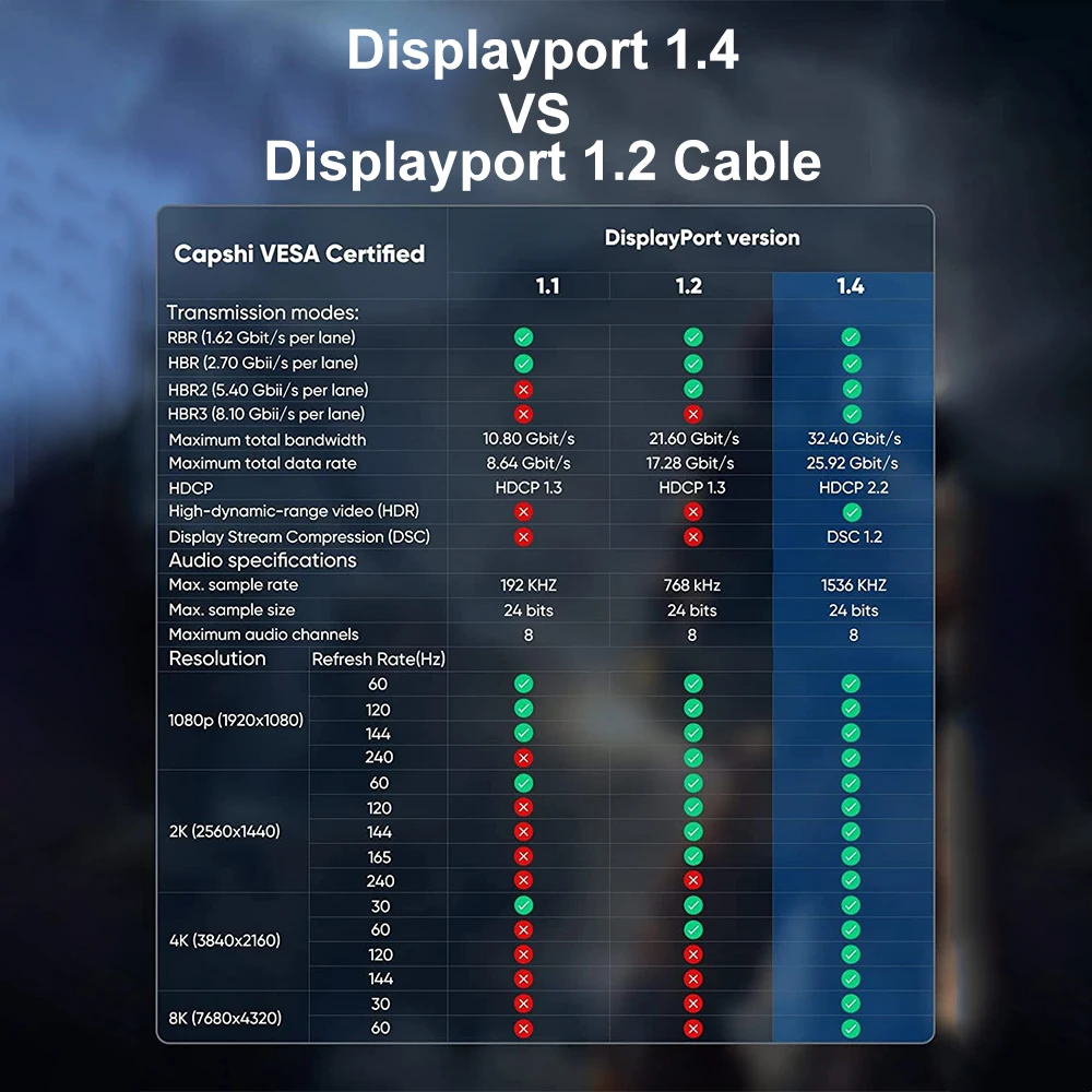 【Cable DisplayPort 8K UHD】Los cables DisplayPort 1,4 de ultra alta velocidad ZOGUO admiten resolución de hasta 8K (7680x4320) incluyendo 5K (5120x2880) a 60Hz, 4K Ultra HD (3840x2160 @ 144Hz) y 1440P 2K @ 165Hz,1080P @ 240Hz.