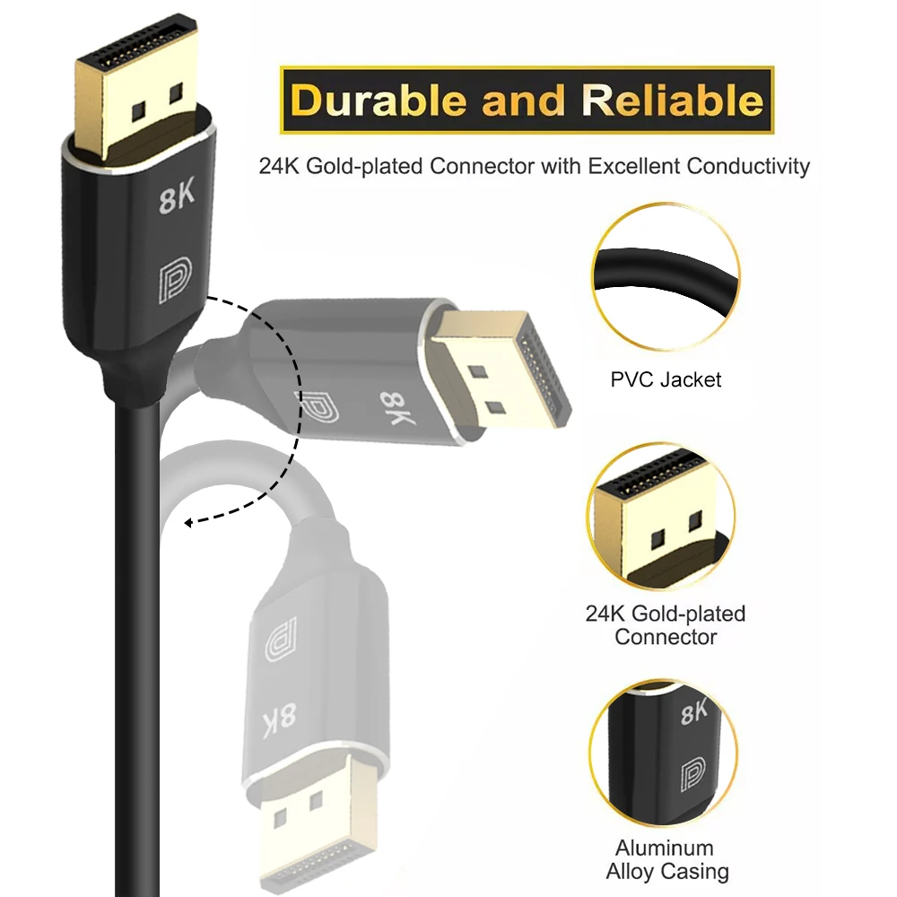 【Materiales de alta fiabilidad】Los cables ZOGUO 8K DisplayPort 1,4 están hechos de conductores de cobre sólido puro 100% con blindaje de triple capa para resistir interferencias y garantizar una transmisión de señal estable. Carcasa duradera y gruesa, conectores chapados en oro de 24 quilates para garantizar una durabilidad y fiabilidad superiores. La cubierta de PVC puede resistir la corrosión y soportar más de 10000 enchufes y desenchufes.