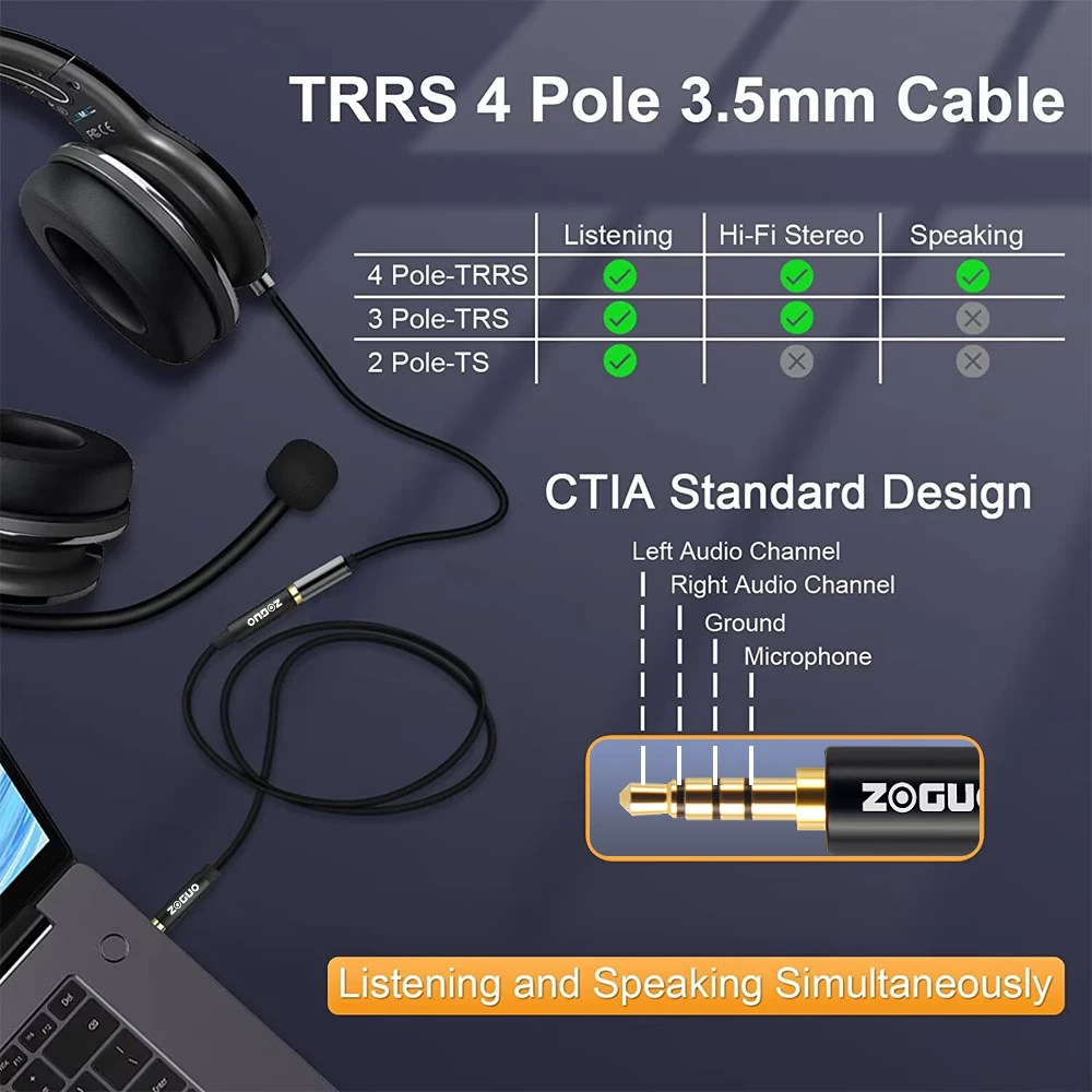 ZOGUO Auriculares 3,5mm Cable de extensión 4 polos TRRS con micrófono