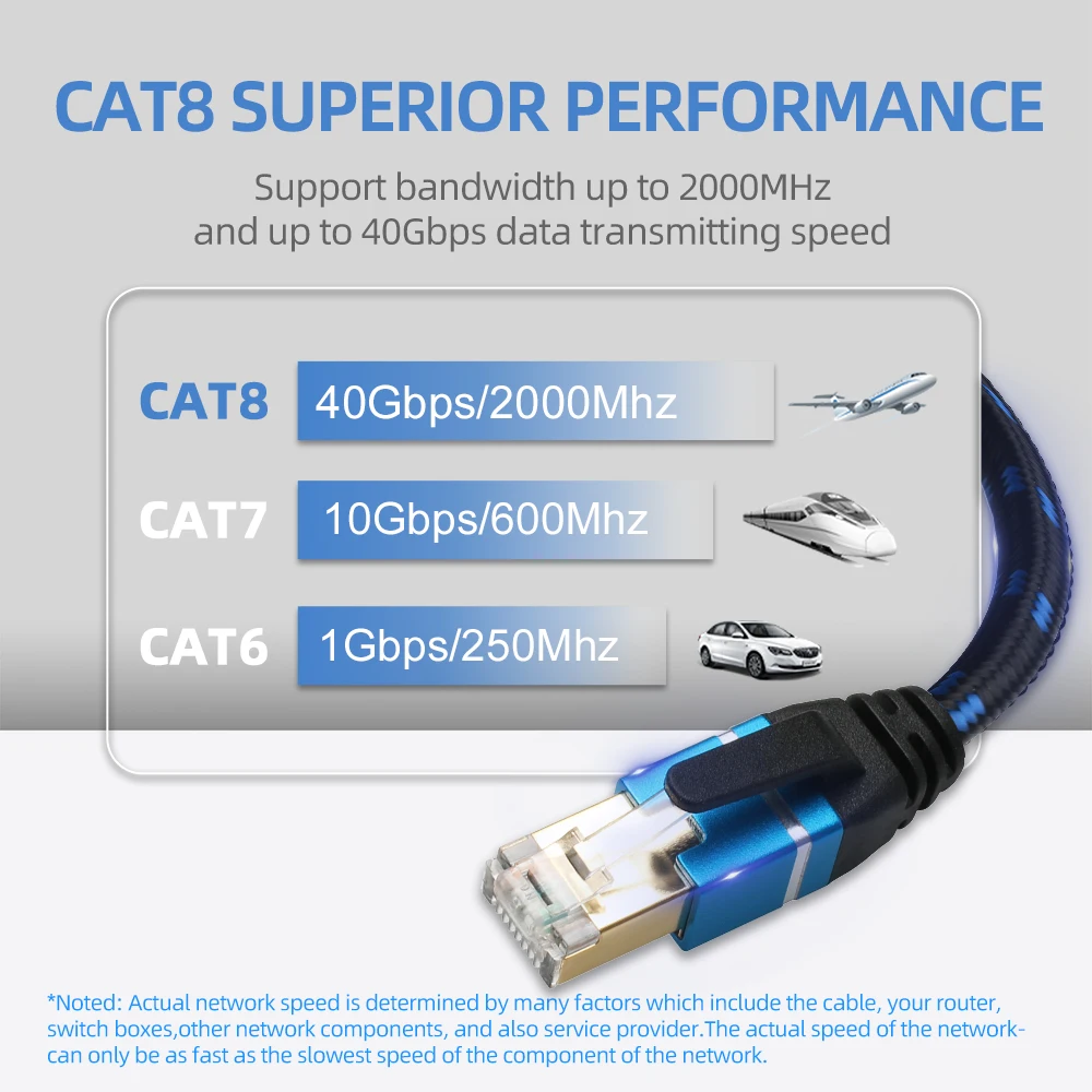🚀40 Gbps 2000 Mhz de alta velocidad:ZOGUOEl cable Ethernet Cat 8 admite ancho de banda de hasta 2000 MHz y velocidad de transmisión de datos de 40 Gbps, lo que garantiza una velocidad de red estable para jugar en línea, navegar por Internet, transmitir video HD en línea, cargar, descargar y más.