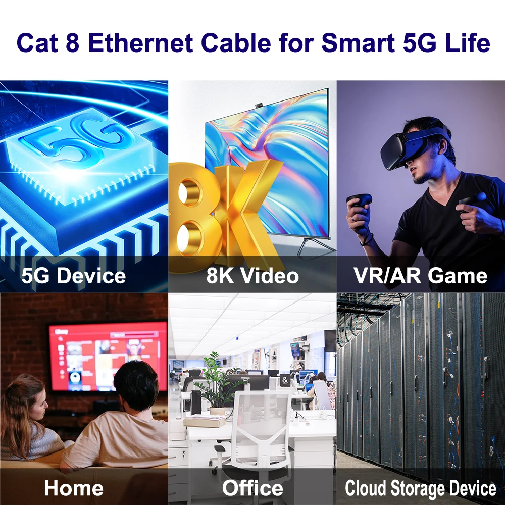 🚀 Amplia compatibilidad:Con dos conectores RJ45 blindados en ambos extremos, el cable Ethernet CAT 8 funciona perfectamente con con conmutador de red, cámara IP, enrutador, ADSL, adaptadores, módem, PS3, PS4, X-box, servidor de red, impresora de red, teléfono VoIP, computadora portátil, acoplador., paneles de conexión, concentradores, Smart TV y otros dispositivos con conector RJ45.Es totalmente compatible con los estándares de cable Cat7/Cat6a/Cat6/Cat5e más antiguos.
