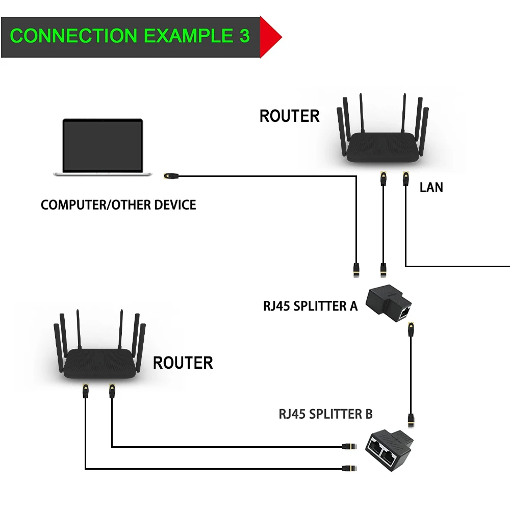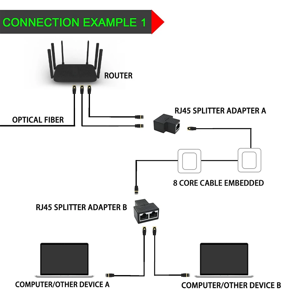 CONECTOR DIVISOR ETHERNET ZOGUO USO- (1) Utilice un solo adaptador: se puede utilizar como extensor de cable Ethernet, pero solo el puerto 1 está disponible para ser utilizado. (2) un par de adaptadores Utilice: una red se puede dividir en dos, habilitando dos dispositivos en línea al mismo tiempo. Imagen de exposición del producto de referencia.