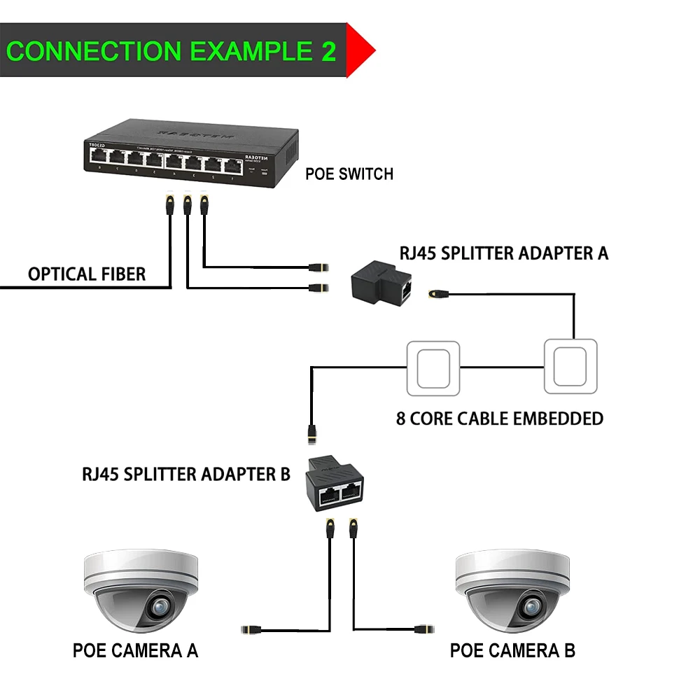 PRINCIPIO DE FUNCIONAMIENTO-El adaptador divisor de Internet es para dividir un cable de red preintegrado original (8 núcleos) en dos grupos (1236/4578), respectivamente, fecha de transmisión. El divisor Lan es una conexión puramente física, y no tiene la función de asignar una dirección IP, tampoco con el enrutador o el interruptor. La transmisión de señal de dos grupos no interfiere entre sí. Se deben usar pares al instalar.
