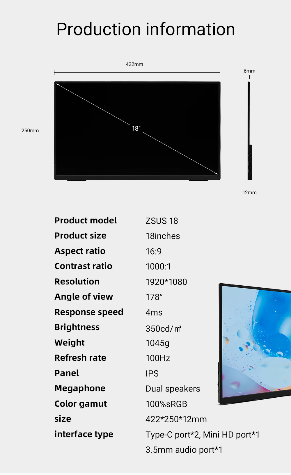 ZSUS 2025-Nueva pantalla portátil 1080P de 18 pulgadas