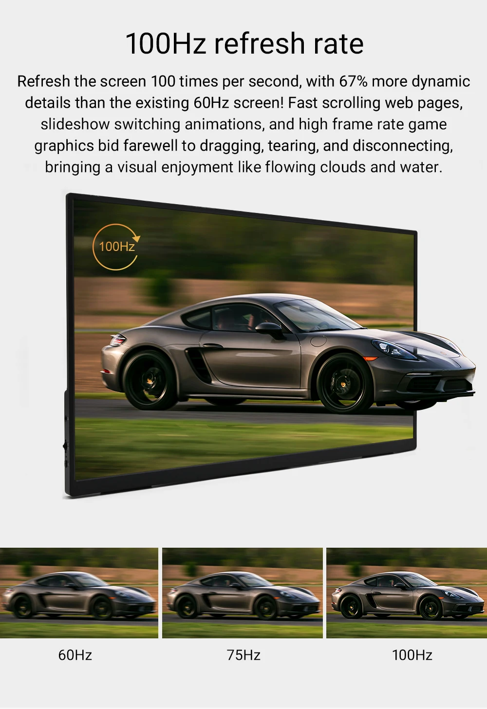 2023 Innovation pantalla portátil de 100 HZ con profundidad de color de 8 bits, la transición de color será más suave y delicada, los colores serán más ricos y brillantes, y los colores reales de los objetos se pueden restaurar con mayor precisión.Cuanto mayor sea el número de bits, más uniforme será la transición de color.
