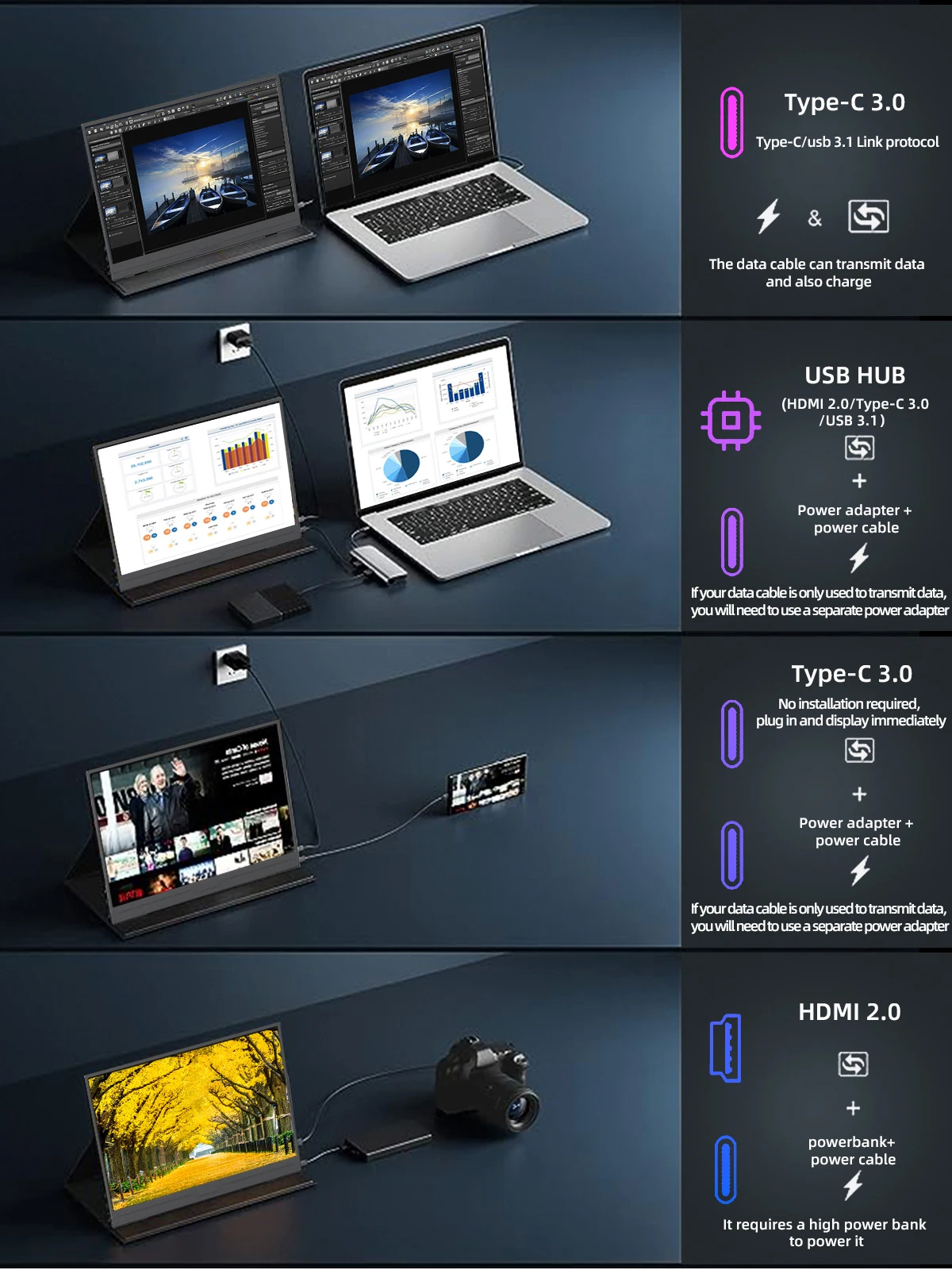 Mini Puerto HDMI incorporado que la prueba plug-in más de 3000 veces. El soporte de la carcasa de cuero está hecho de exterior de cuero PU duradero, un forro suave para mantener su monitor seguro. La interfaz tipo C proporciona un flujo de datos rápido y estable.