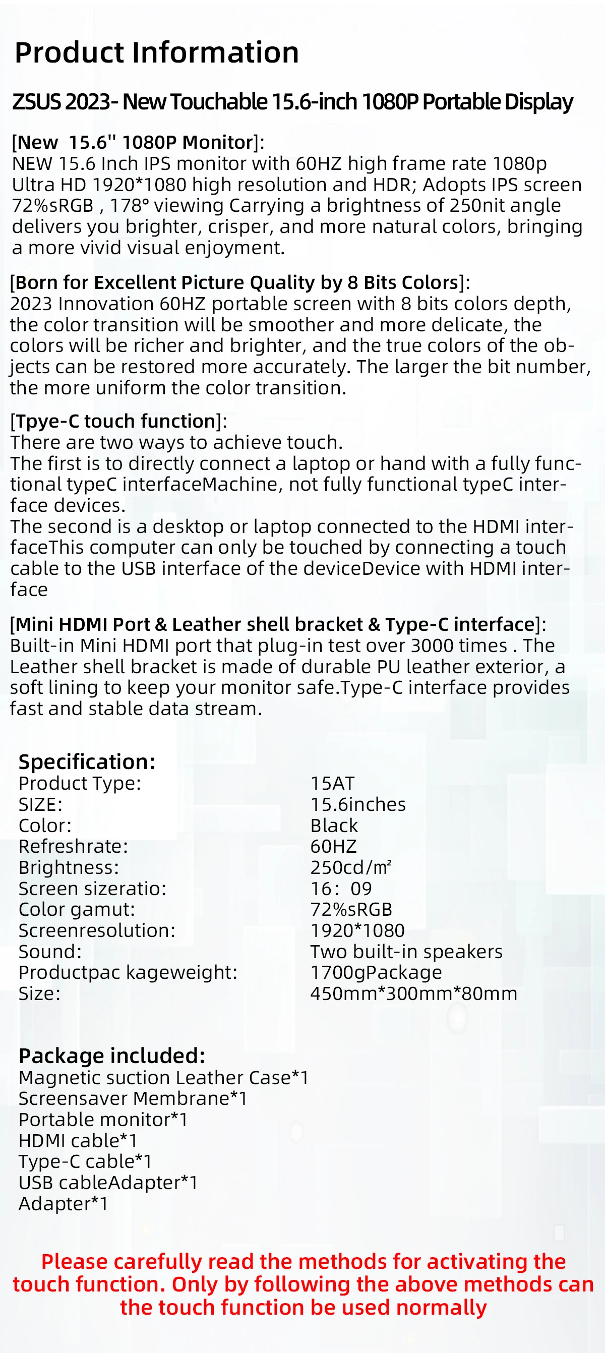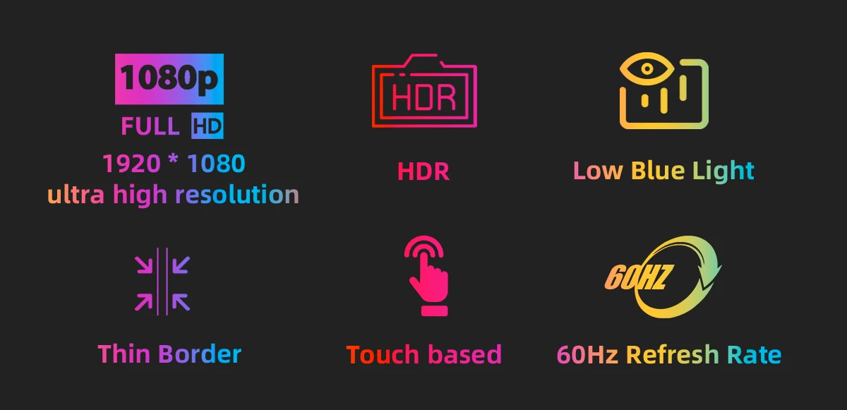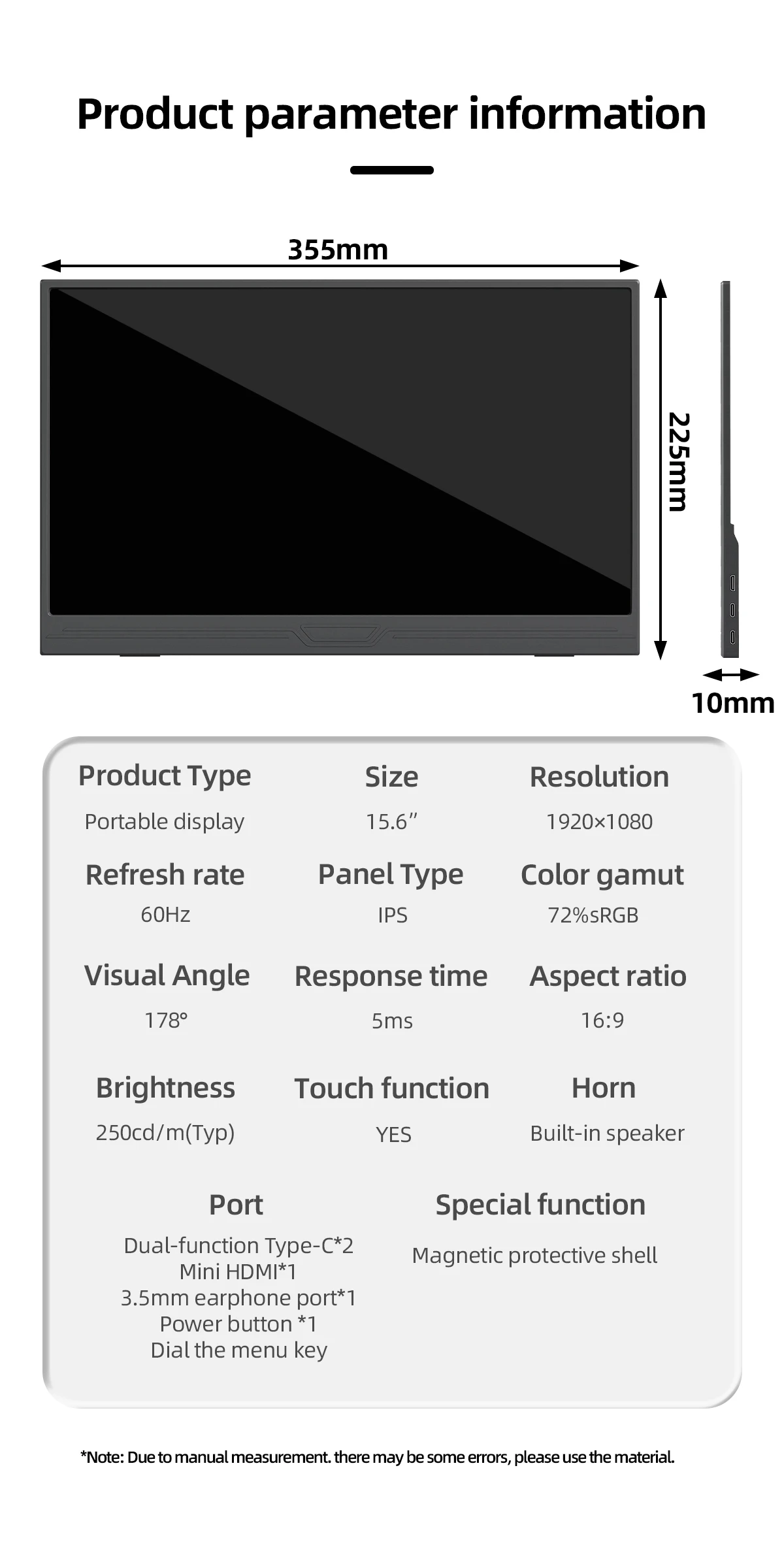 • Pantalla táctil de 15.6 pulgadas :Disfrute de una experiencia de visualización impresionante con la pantalla táctil de 15.6 pulgadas, que ofrece una resolución de 1920*1080 HDR y un brillo de 300cd/m.