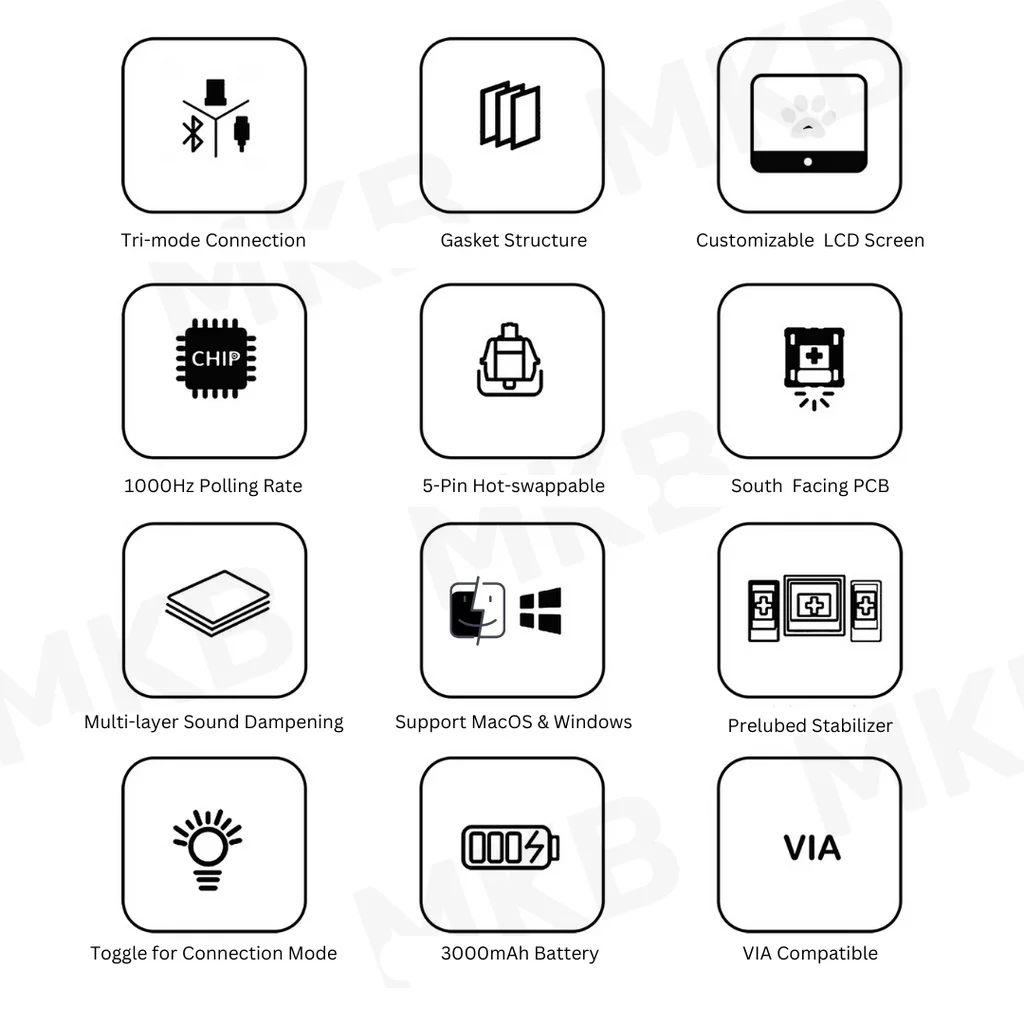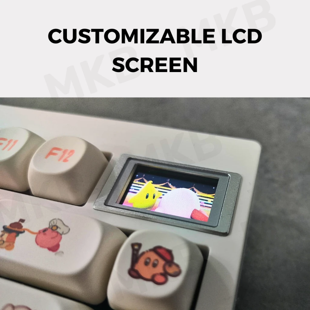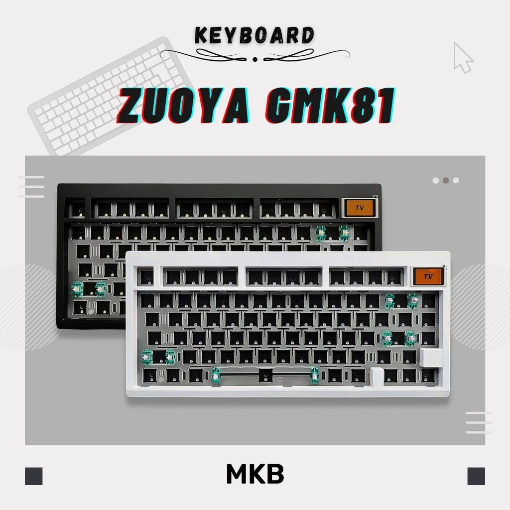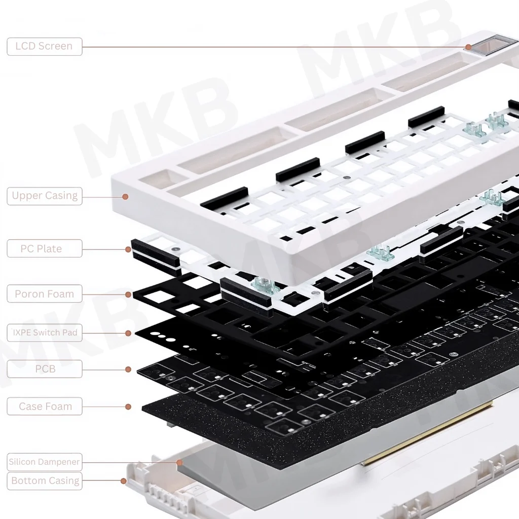 Nombre del producto: Zuoya GMK81-Kit de teclado montado en Junta de 75% Poron con pantalla LCD personalizable, 79 teclas, placa de policarbonato, placa de espuma de placa Poron, almohadilla de interruptor IXPE, espuma de caja estándar, amortiguador de silicio, RGB orientado al sur, tri-modo (Bluetooth, 2,4 Ghz, tipo C con cable), batería de 3000MAh, PCB intercambiable en caliente de 5 pines y compatible con VIA.
