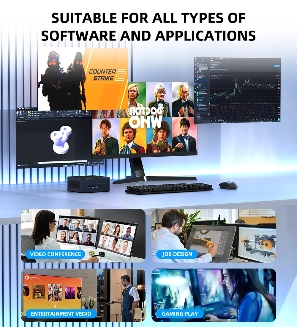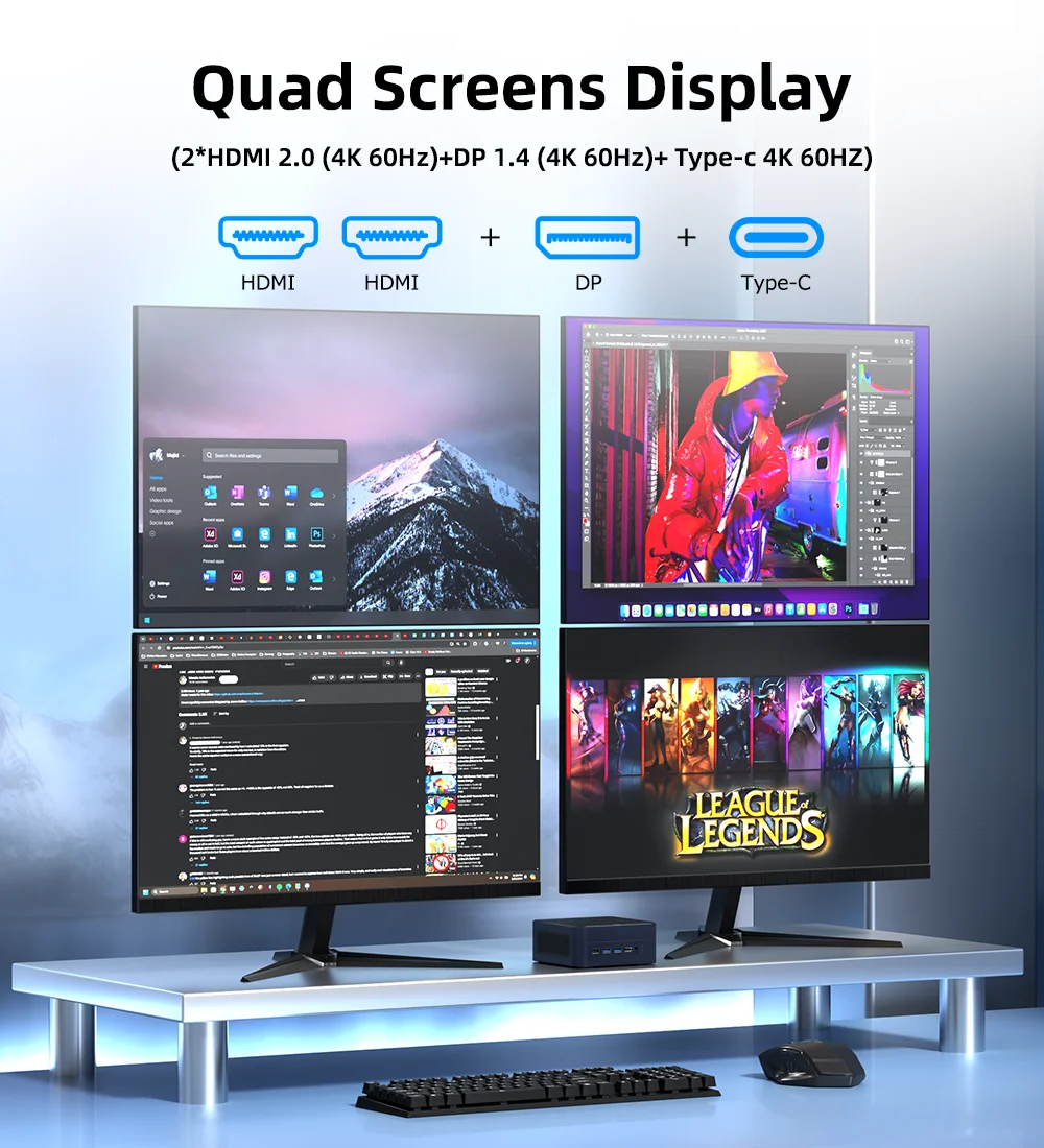 HDMI Dual 2.1 + USB4 (modo DP Alt), compatible 4x pantallas 4K—ideal para el comercio de existencias, edición de vídeo o vigilancia.